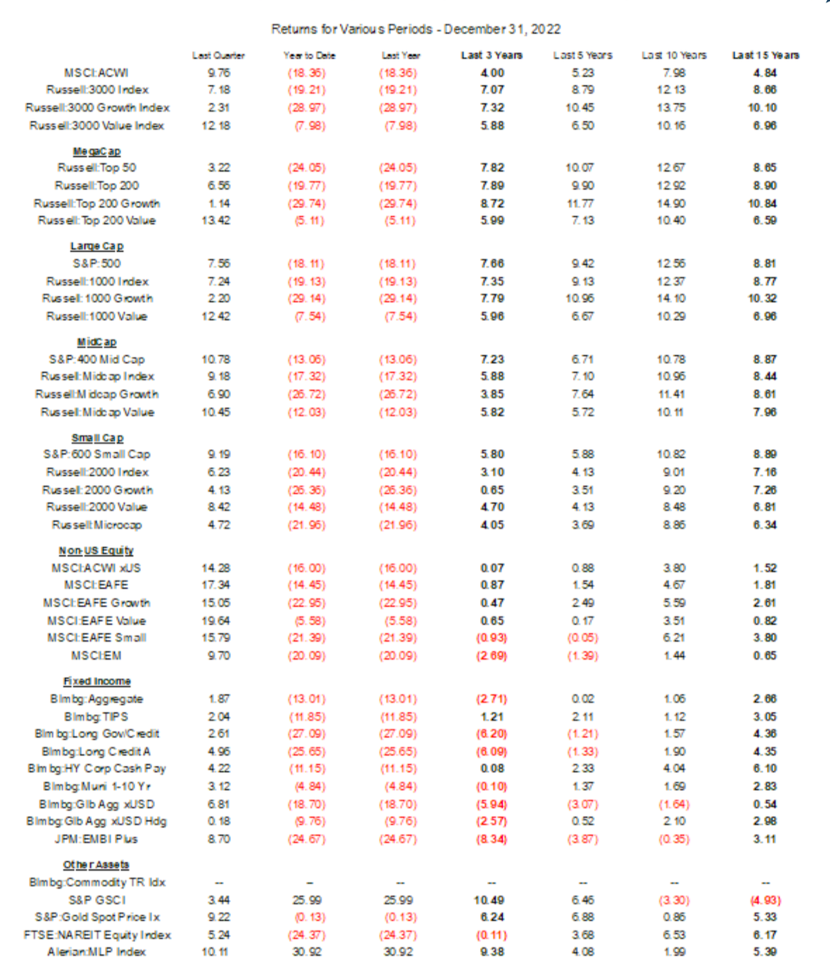 The bond market suffered from a case of the blues this year with the Bloomberg Aggregate tumbling 13% and wiping out 5 years of returns. Other economic factors were also feeling pretty low this holiday season. Existing home sales fell for the 10th straight month (down 7.7% month over month and 35.4% from the previous year) due to higher mortgage rates and lack of supply. In addition, leading economic indicators are down 3.7% over the last 6 months, consumer confidence is at an all-time low, and China’s reopening has resulted in yet another wave of Omicron contagion. It’s enough to make your teeth chatter.