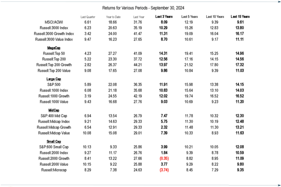 To that end, quarterback, Jerome Powell, has been carefully assessing the temperature of the field and surprised the crowd with a “Hail Mary” pass in the guise of a 50-basis point rate cut in September. This Federal Reserve audible from the pocket fulfilled many investors’ fantasies as markets rallied on the move. The half-point cut was seen as a win on beating inflation and a shift towards more concern over weakness in the labor market.