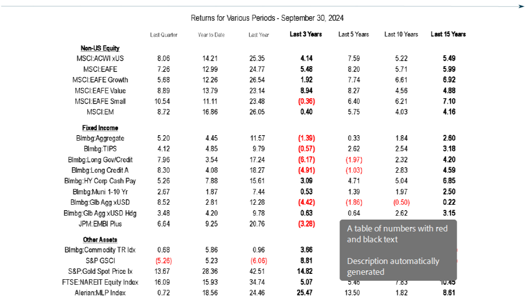 Global ex-U.S. equities (MSCI ACWI ex USA: +8.1%) also finished the quarter strong, boosting returns year-to-date (+14.2%). Within developed markets, Value (MSCI World ex-USA Value: +9.7%) outperformed growth (MSCI World ex-USA Growth Index: +5.9%) by a wide margin. Real Estate (MSCI EAFE Real Estate: +17.4%) and Utilities (MSCI EAFE Utilities: +15.6%) were the strongest-performing developed market sectors. Japan (MSCI Japan: +5.7%) was up for the quarter, but stocks declined in September following the election of a new prime minister known for pushing fiscal discipline and being a China hawk.